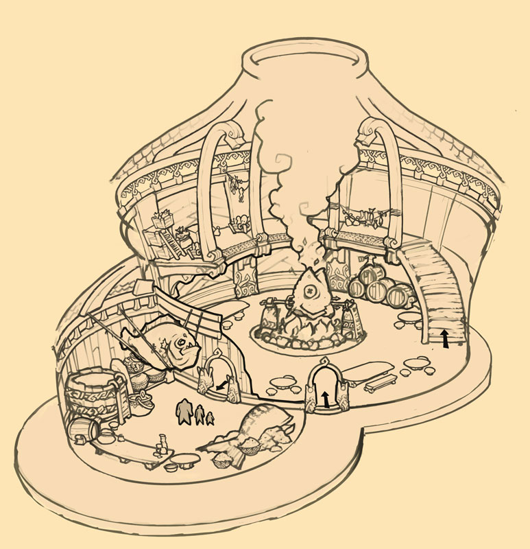 Дом гибберлингов: Традиционное жилище гибберлингов. Так как основным их занятием было мореходство, то рыба, развешенная повсюду - их главный источник пищи. |